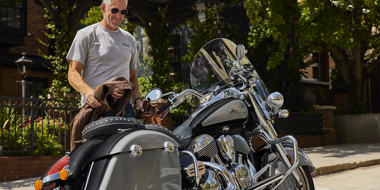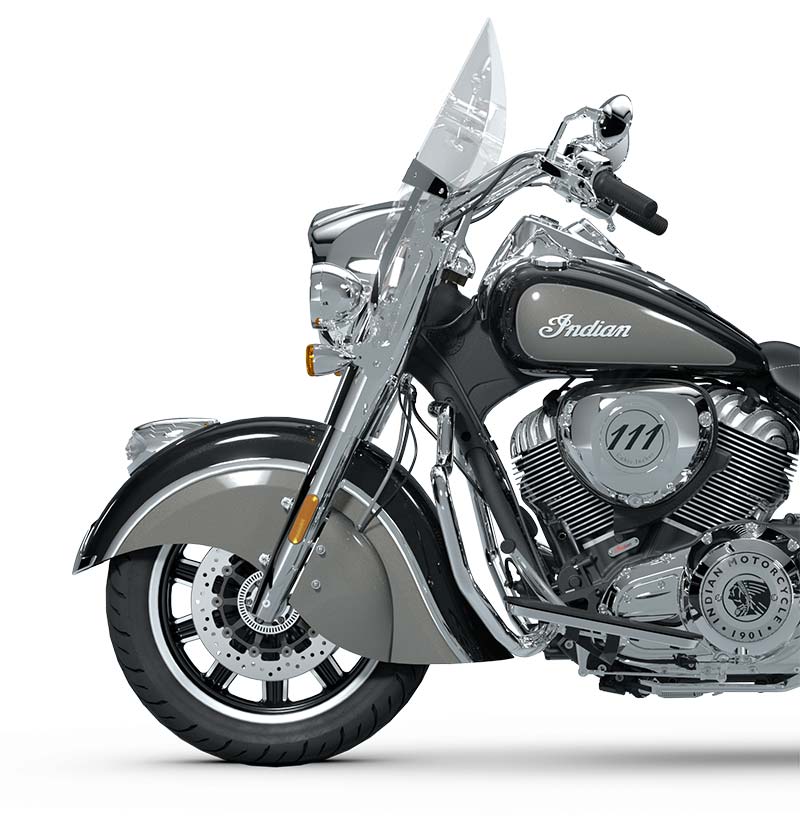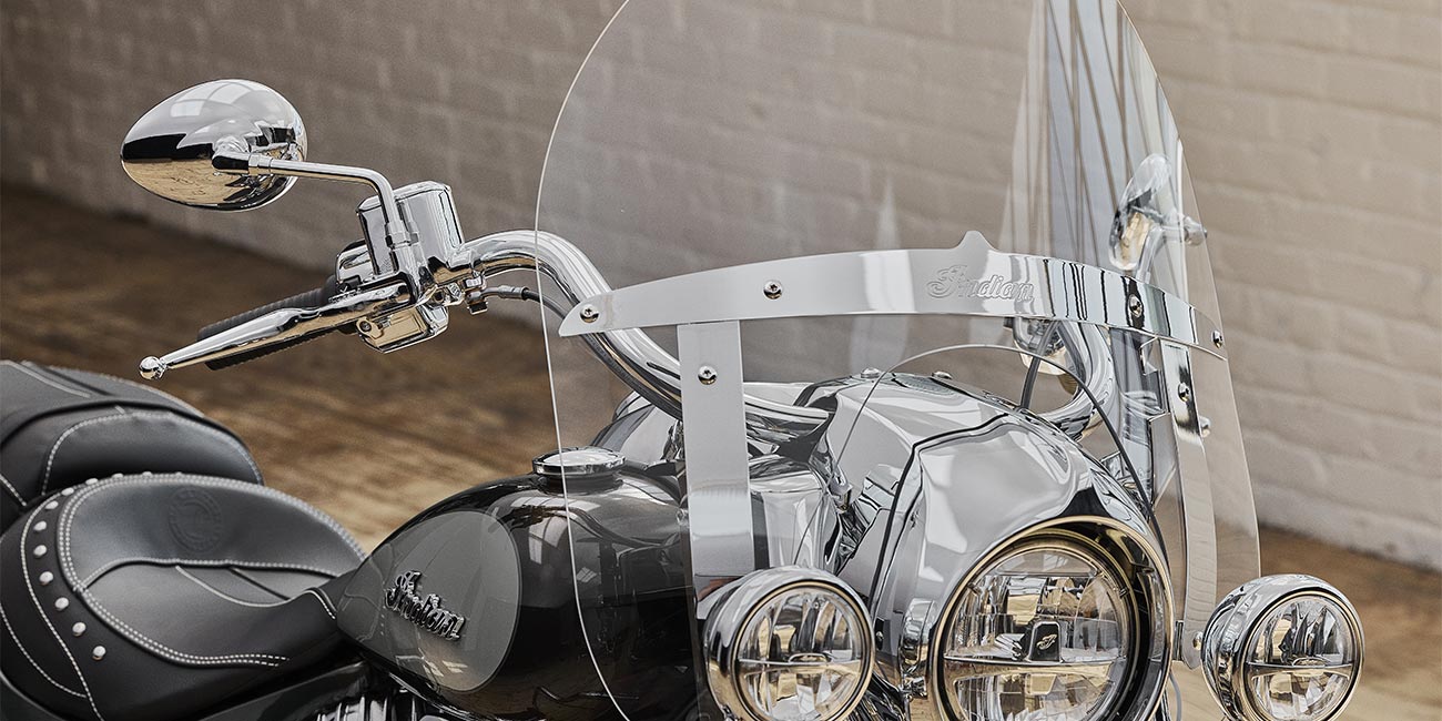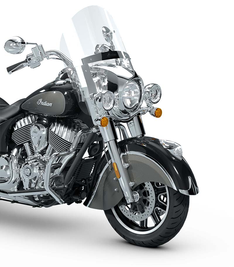 | Equipo Estándar | Parabrisas de liberación rápida; asiento de cuero genuino; alforjas rígidas con bloqueo remoto, defensas de carretera; control de la presión de los neumáticos; barra de luces; modos de manejo, ABS; control de crucero; encendido sin llave; emblema Indian® en el tanque; puerto de carga de 12 V. |